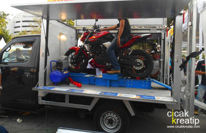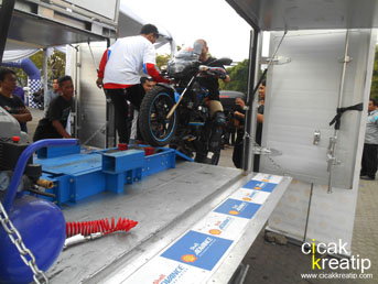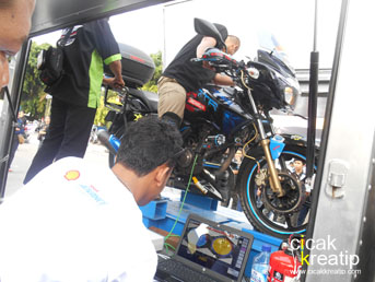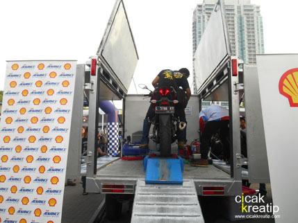 Dynotest, sejatinya dilakukan diatas tanah dengan kondisi ruangan khusus. Hal yang unik ketika berbaur dalam acara Shell beberapa waktu yang lalau di Surabaya (disini artikelnya…) didalam rentetan acara yang ada, ternyata ada yang namanya dynotest kompetition. Uniknya dynotest yang dibawa merupakan dynotest yang ditaruh diatas mobil, sehingga jika ingin dyno, prosesnya motor harus naik diatas mobil dulu.