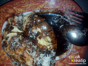 Kalau di jawa pisang goreng ini masuk jenis pisang susu. Dikupas dan dicemet pakai lembaran kayu layaknya papan cetak. Setelah itu barulah pisang di bakar di atas arang, dengan finishing parutan kelapa didampingi susu coklat diatas pisang, hem…lidah rasanya ngiler, sedotttt…yang pasti legit banget. Satu porsi isinya 3 pisang, didampingi teh hangat dan semilirnya angin pantai, beh..malam yang menyenangkan sekali.