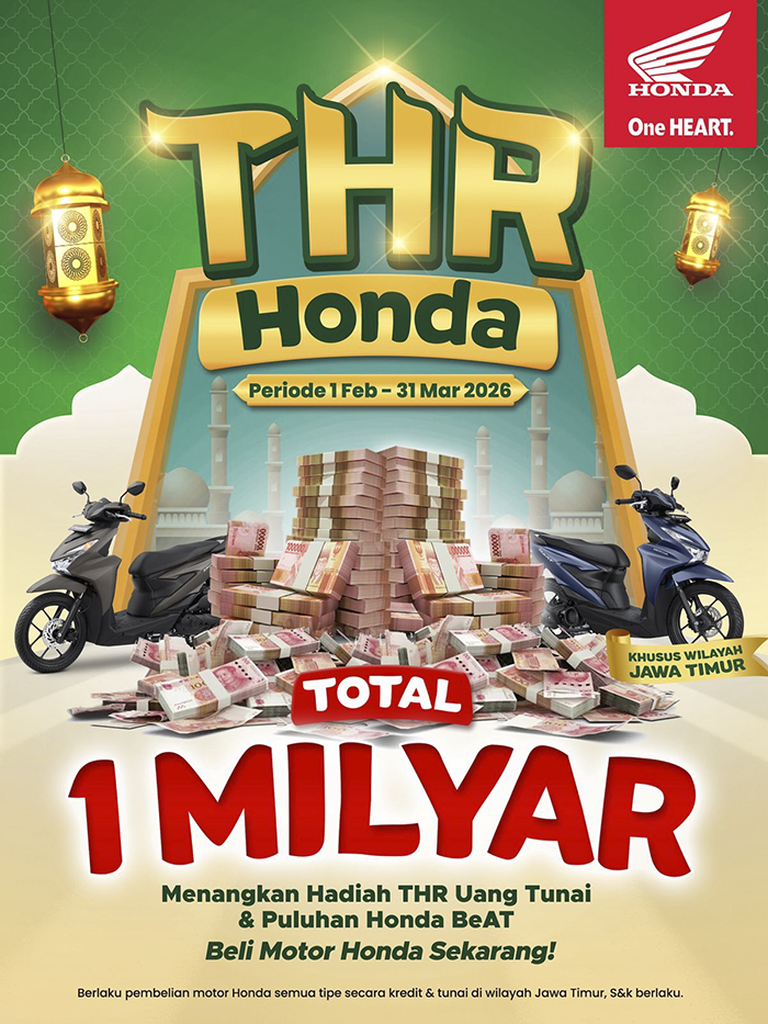 Cicakkreatip.com – Surabaya, Februari 2026 – Menyambut momen Ramadan dan Hari Raya Idulfitri 2026, PT Mitra Pinasthika Mulia (MPM Honda Jatim), distributor sepeda motor Honda wilayah Jawa Timur & Nusa Tenggara Timur, kembali menghadirkan program apresiasi spesial bagi masyarakat melalui THR Honda 2026 dengan total hadiah mencapai Rp1 miliar, khusus untuk wilayah Jawa Timur.