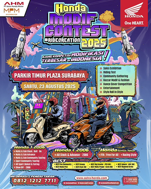 “Selama lebih dari satu dekade, Honda Modif Contest menjadi ajang yang dinantikan para modifikator Tanah Air. Kami mengajak seluruh masyarakat Surabaya dan sekitarnya untuk hadir, menikmati karya-karya terbaik, dan merasakan kemeriahan HMC 2025. Ini adalah momentum untuk mengapresiasi kreativitas anak bangsa sekaligus memperkuat silaturahmi di dunia otomotif,” ujar Suhari, Marketing Communication & Development Division Head MPM Honda Jatim.
