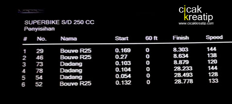 Yaggg…Yamaha R25 sekali lagi asepin Kawasaki Ninja, dimana dikala pertarungan three for three ini Yamaha R25 menduduki podium pertama dan kedua dengan best time 8.134 dan 8.364 detik. Sedangkan podium ke 3 ada pada Kawasaki Ninja dengan best time 8.776 detik. Menarik memang, setidaknya hal ini membuat dunia adu speed di jawa timur makin rame.