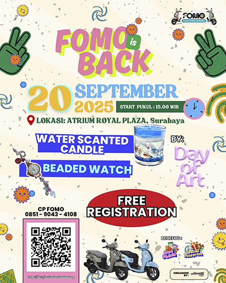 Puncak rangkaian kegiatan akan diramaikan oleh Fazzio Hybrid Movement (FOMO) is Back pada 21 September 2025, mulai pukul 15.00 WIB di Atrium Royal Plaza. FOMO menghadirkan workshop kreatif hasil kolaborasi dengan Day of Art, di antaranya Water Scanted Candle dan Beaded Watch. Seluruh aktivitas dapat diikuti melalui free registration, serta peserta berkesempatan mendapatkan free merchandise dan special doorprize. FOMO menjadi wadah ekspresi generasi muda Surabaya untuk berkreasi, berkumpul bersama komunitas, dan merasakan langsung gaya hidup modern bersama Yamaha Fazzio Hybrid-Connected.